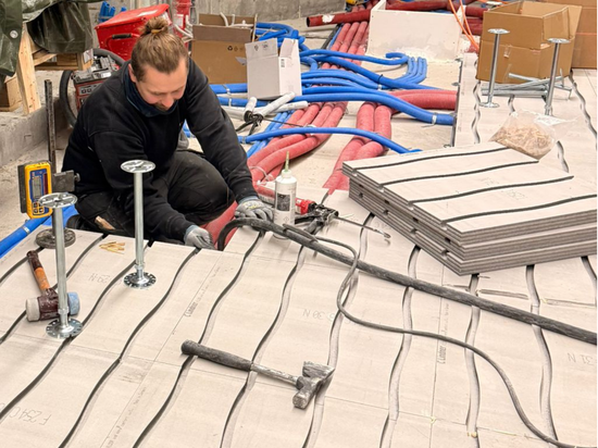 Unsere Doppelboden-Monteure verlegen derzeit Verbund-Heizplatten mit vorbereiteten Rillen zur Aufnahme künftiger Heizleitungen.