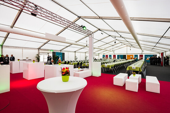 Für diesen Event kam ein breites Sortiment an Zelten und Mietmobiliar zur Anwendung wie Tische, Stühle, Böden, Teppich, Barelemente, Türen, Rampen etc. Die Übergänge zwischen mobiler und bestehender Infrastruktur erforderten zudem eine minutiöse Planung und präzise Montagearbeit.