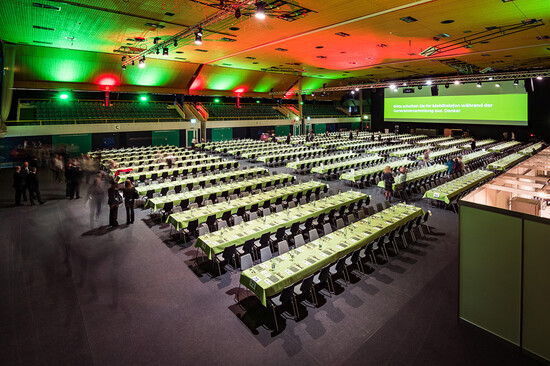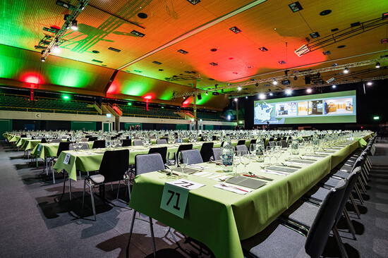 Für die Generalversammlung und das anschliessende Aktionärsfest einer erfolgreichen Regionalbank erstellte Lenzlinger Zeltvermietung die Zeltinfrastruktur inklusive Anschluss an die benachbarte Sporthalle, die für den offiziellen Teil ebenfalls mit Saaltischen und Stühlen von Lenzlinger eingerichtet wurde. Zur Veranstaltung wurden rund 1'200 Aktionäre erwartet.