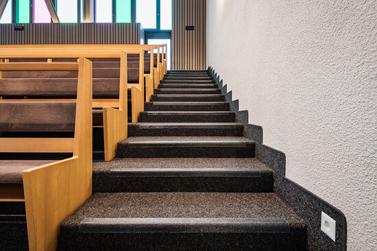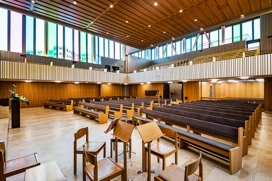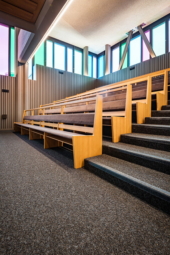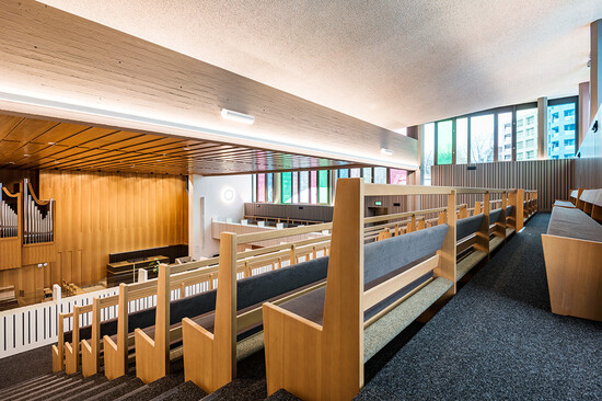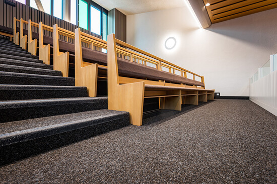 Die 1982 erbaute Neuapostolische Kirche Uster wurde 2016 umfassend renoviert. Lenzlinger wurde mit dem Ersatz des Bodenbelags auf der Empore beauftragt.