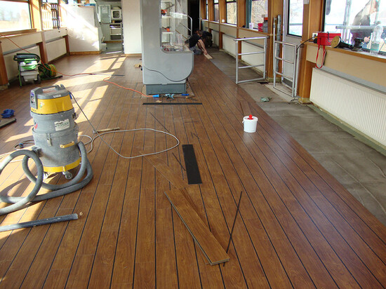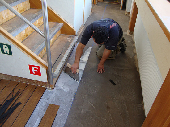 So auch die durch Lenzlinger ausgeführte Erneuerung des Bodens auf dem Hauptdeck. Das Entfernen des alten Linoleumbelages brachte überraschend einen teilweise feuchten Spanplattenboden zum Vorschein. Dieser musste zuerst ersetzt werden, bevor der neue Unterbodenaufbau mit dem neuen Oberbelag eingebracht werden konnte.