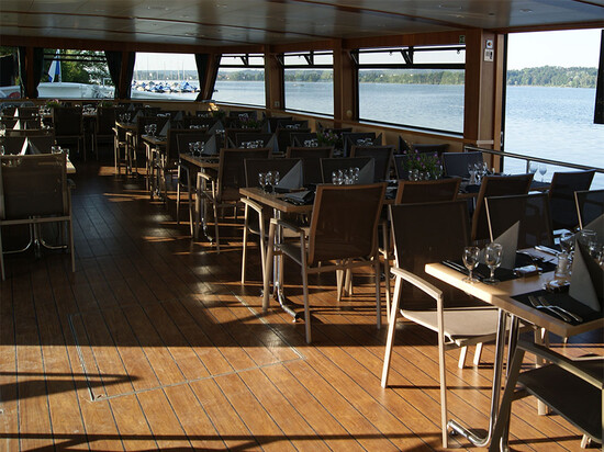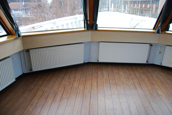 Eingesetzt wurde ein Designbelag als Teak- und Ebenholzimitat in Schiffplankenoptik. In Schiffsküche und Toiletten wurde ein Sicherheitsbelag in einem neutralen Grauton verlegt.