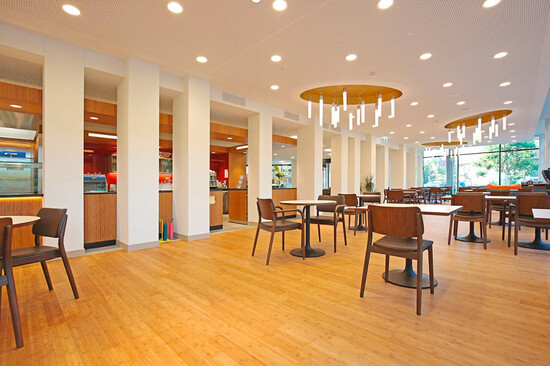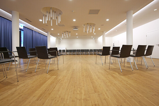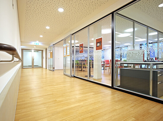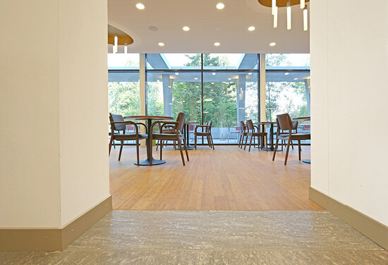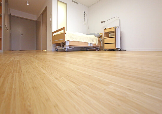 Die Böden in den Zimmern und Korridoren des Alt- und Neubaus wurden mit Bambusparkett im Format 500x70x10 mm im Schiffsboden-Muster belegt. Die Oberflächen dieser werkseitig geölten Produkte wurden mit Woca Pflegeöl natur schlussbehandelt. Im Aufenthaltsraum, der Cafeteria und im Mehrzweckraum des Neubaus wurde ein Bambus-Massivparkett eingesetzt. Dieser Boden wurde nach der Verlegung geschliffen und mit Woca Hight solid Öl natur behandelt.