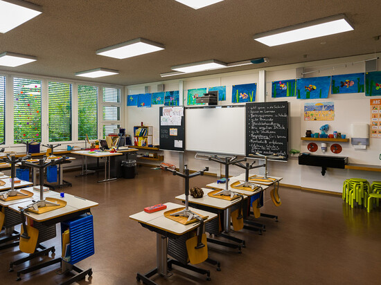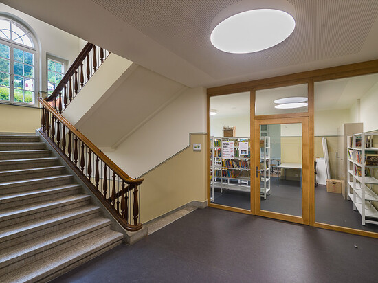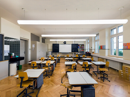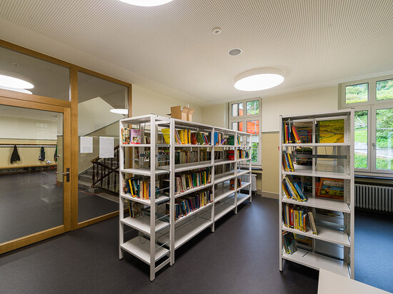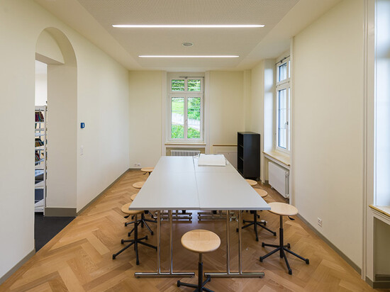 In den Klassenzimmern sollten die bestehenden, im Fischgratmuster verlegten massiven Parkettböden erhalten bleiben. Dazu demontierte Lenzlinger die Bodenelemente und unterzog dieser einer Auffrischung. Bevor sie wiederverlegt wurden, musste die Unterkonstruktion in Teilen für die Verlegung neuer Kabel aufgeschnitten und wieder ergänzt werden. Ebenso mussten einzelne Parkettfragmente unterschiedlicher Dimension aus Eiche und Buche ersetzt werden. Schliesslich wurden die wiederverlegten Holzböden neu geschliffen und geölt.