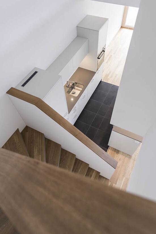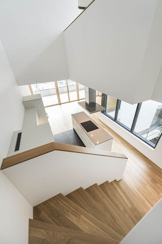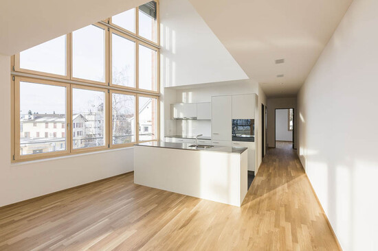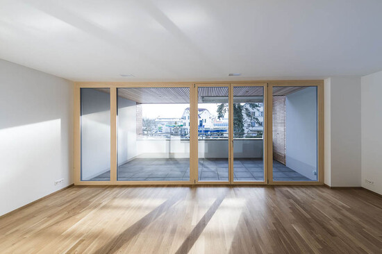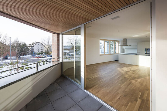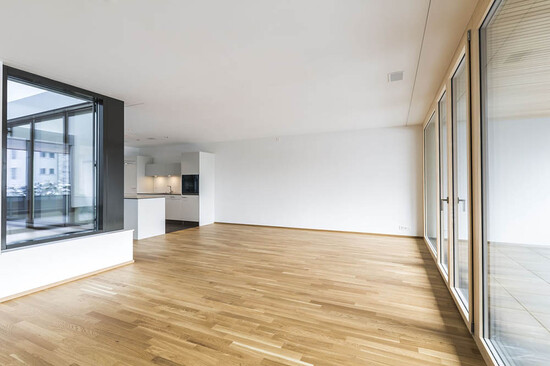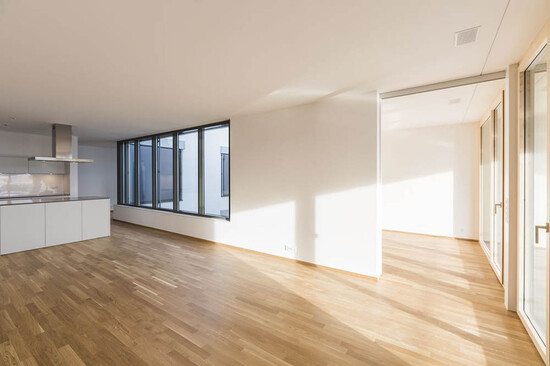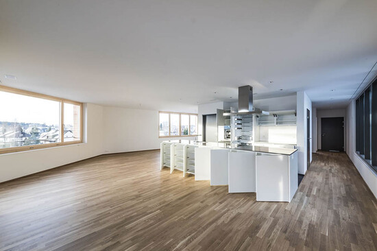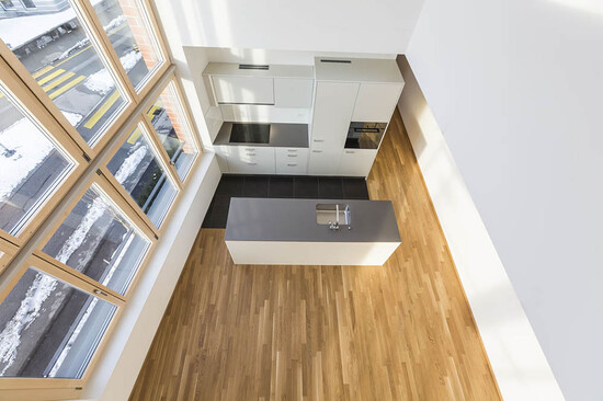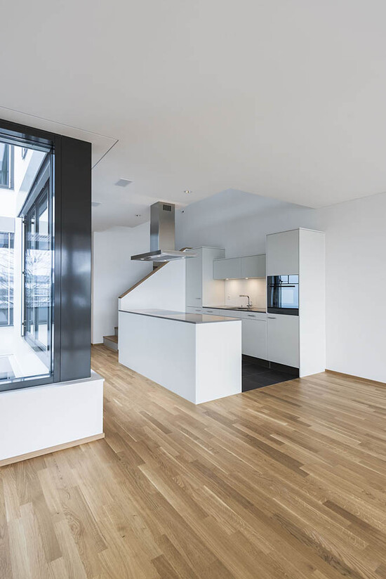 Nach Vorbereitung der Böden verlegte Lenzlinger in den Wohnungen ein matt werkversiegeltes Eichenparkett in Schiffboden-Verlegeart. Die Dimension der Parkettstäbe beträgt 590 x 68 x 10 mm. Der Holzboden wurde anschliessend einer Grundpflege mit flüssigem Hartwachs unterzogen.