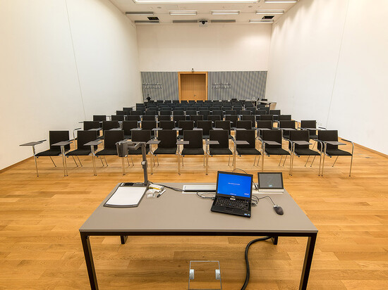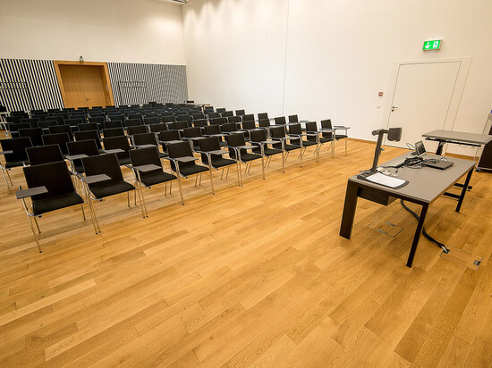 In den Vortragssälen (untere beiden Bilder) wurde der Holzboden in einer einzigen Fläche verlegt. Unter dem Parkett führt eine Hörschleife. Auf dieser wird das Tonsignal durch elektromagnetische Wellen übertragen. Dadurch wird die Tonqualität für schwerhörige Menschen mit passendem Hörgerät markant verbessert.