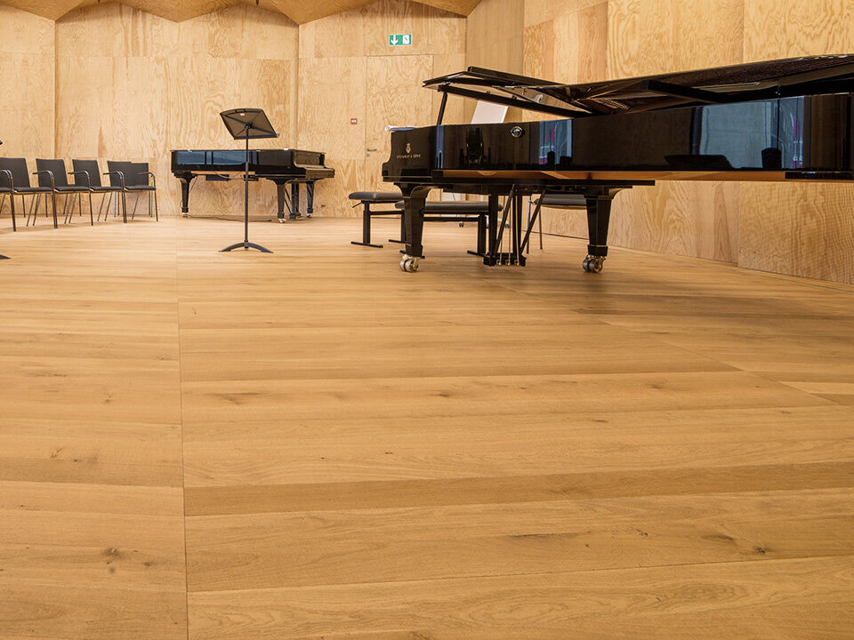 Im Kammermusiksaal (Bild oben) wurde es in französischem Fischgratmuster verlegt. Dabei wurde die Mittelachse des Bodens auf die Mittelachse der Decke abgestimmt.