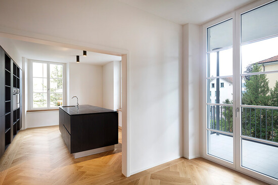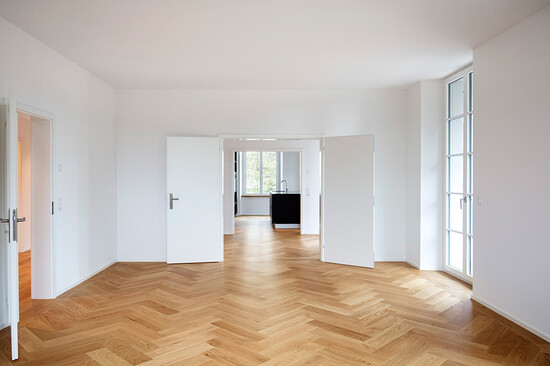 Lenzlinger ersetzte in den Wohnungen (etwa 675 m2) die Bodenbeläge. Mittels Schleifen, Spachteln und Auftragen einer Haftgrundierung wurde der Untergrund vorbereitet. Anschliessend wurde der werkseitig mattversiegelte Eichenparkett eingebracht. In den Korridoren und im Nebenhaus wurde das Parkettprodukt im Schiffsbodenmuster, in den restlichen Zimmern in der Verlegeart Fischgrat mit Wandfries verlegt. Die Dimension der Parkettstäbe beträgt 660 x 153 x 11 mm. Als Abschluss wurden weisse Sockelleisten angebracht.