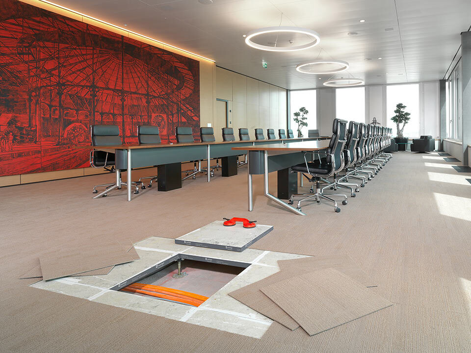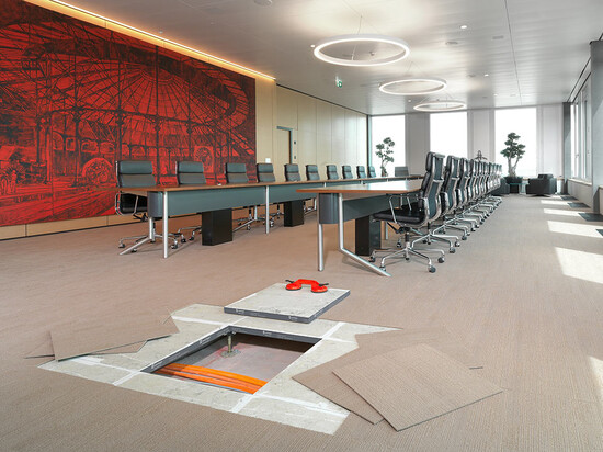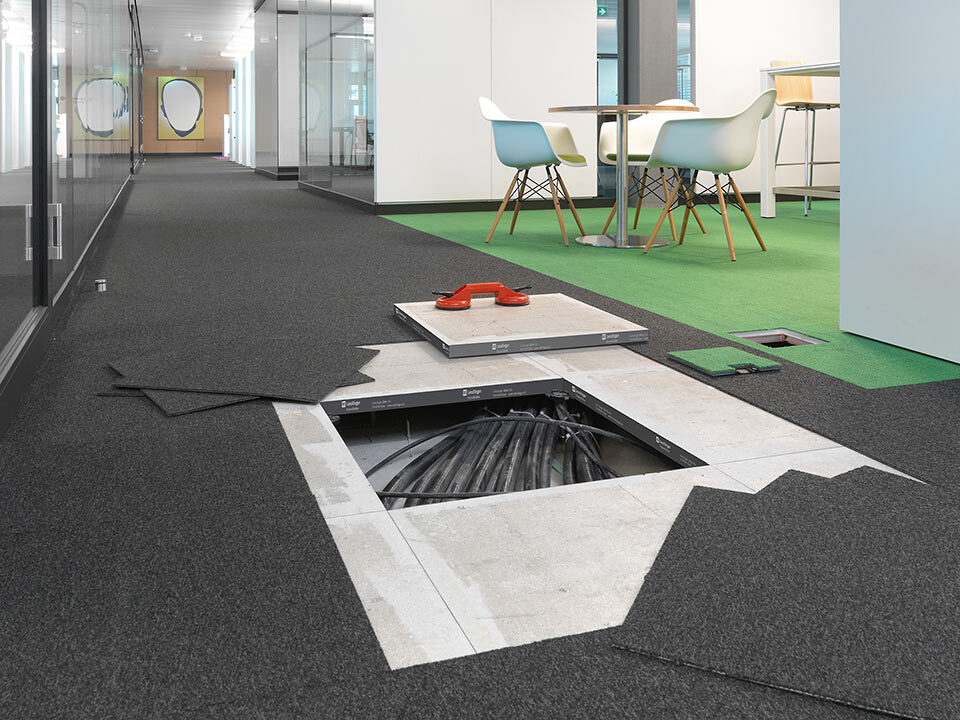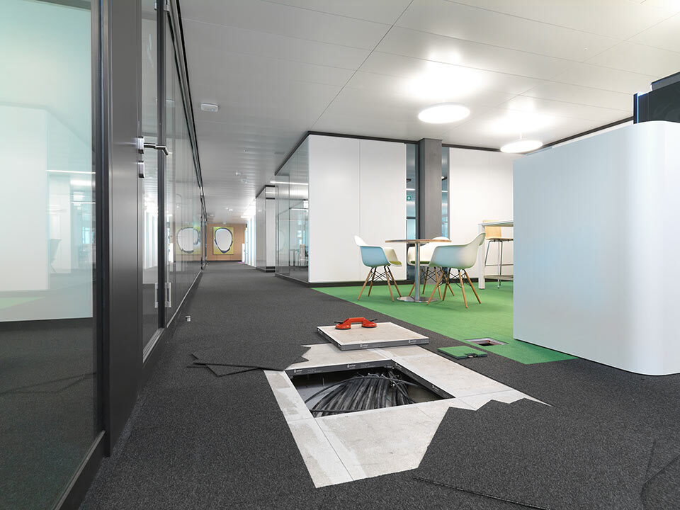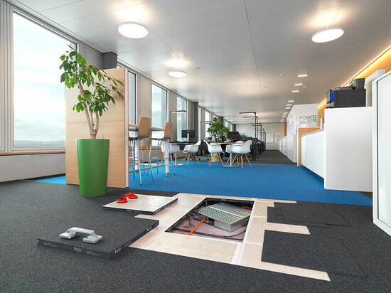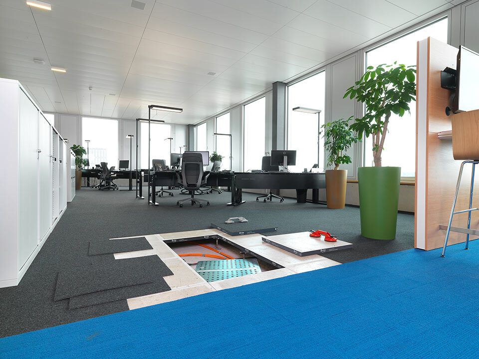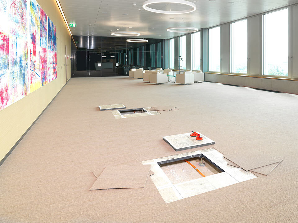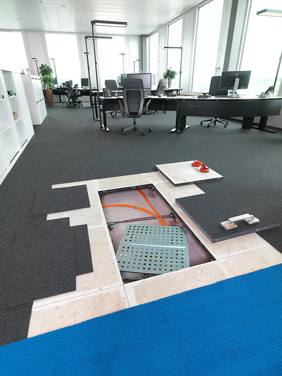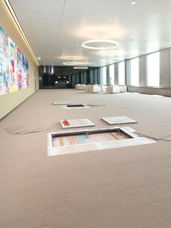 Livraison et installation du faux-plancher en panneaux de plâtre fibré de type PMOO-34 et de dalles de moquette en pose libre. Surface totale: 33 000 m2.
