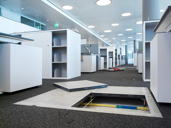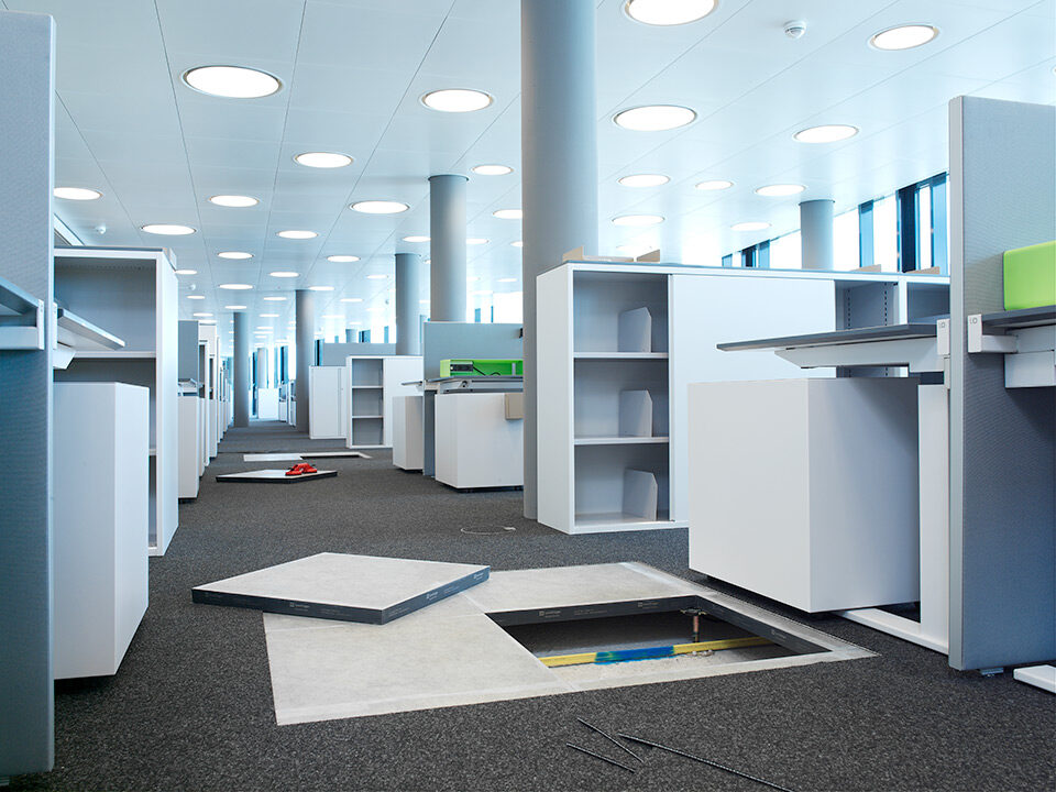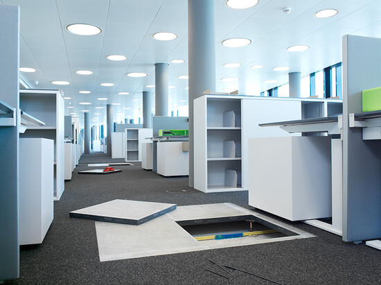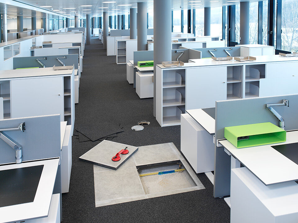Livraison et installation de faux-plancher en panneaux d’aggloméré à haute densité et une sous-construction de type 5 pour environ 1’600 postes de bureau de Credit Suisse répartis sur environ 20’000 m2. Du Kugelgarn a été choisi comme revêtement de surface.