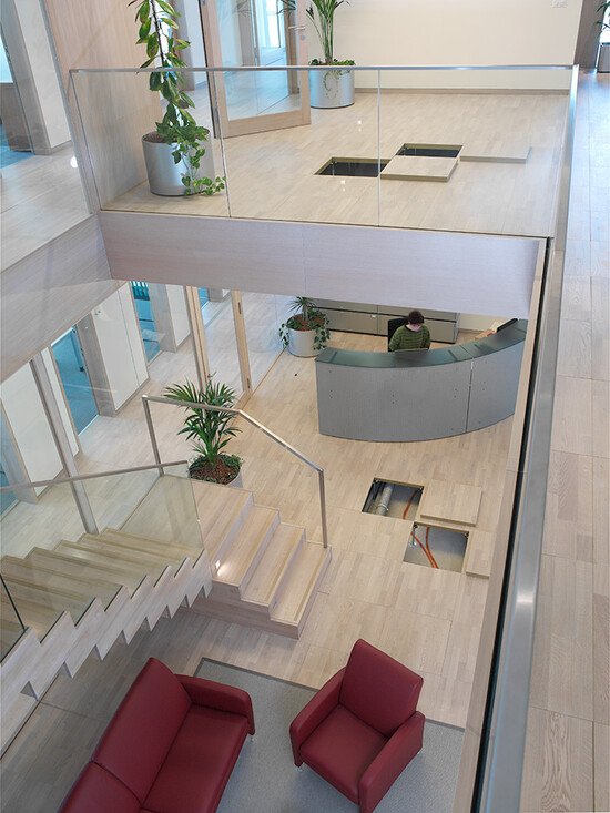 Livraison et installation de faux-plancher avec une sous-construction de type 5 et des panneaux en aggloméré à haute densité couverts d’un parquet à lamelles en chêne blanc huilé. Surface totale de 900 m2.