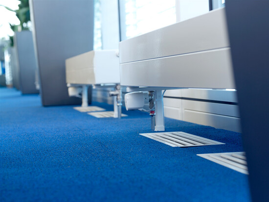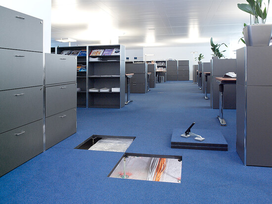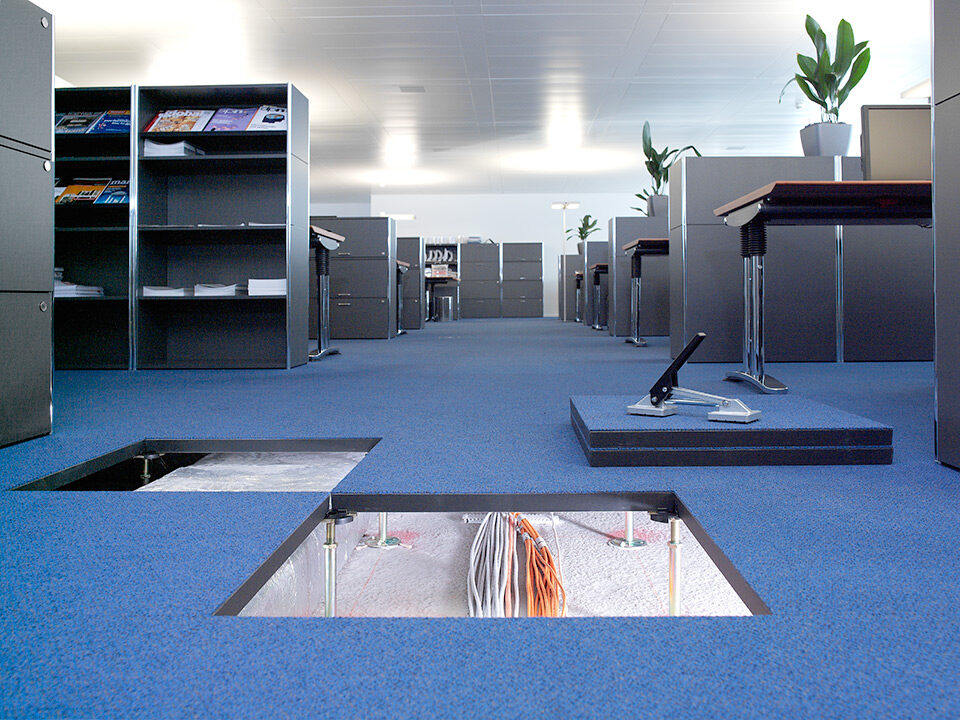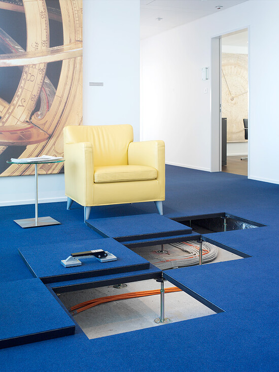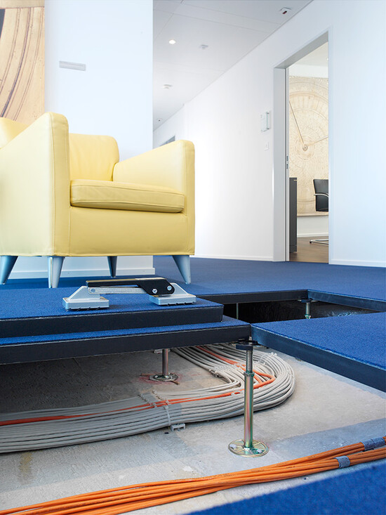 Livraison et pose de 5’300 m2 de faux-plancher avec une sous-construction de type 5 et des panneaux en fibre minérale dotés de revêtements textile appliqués.