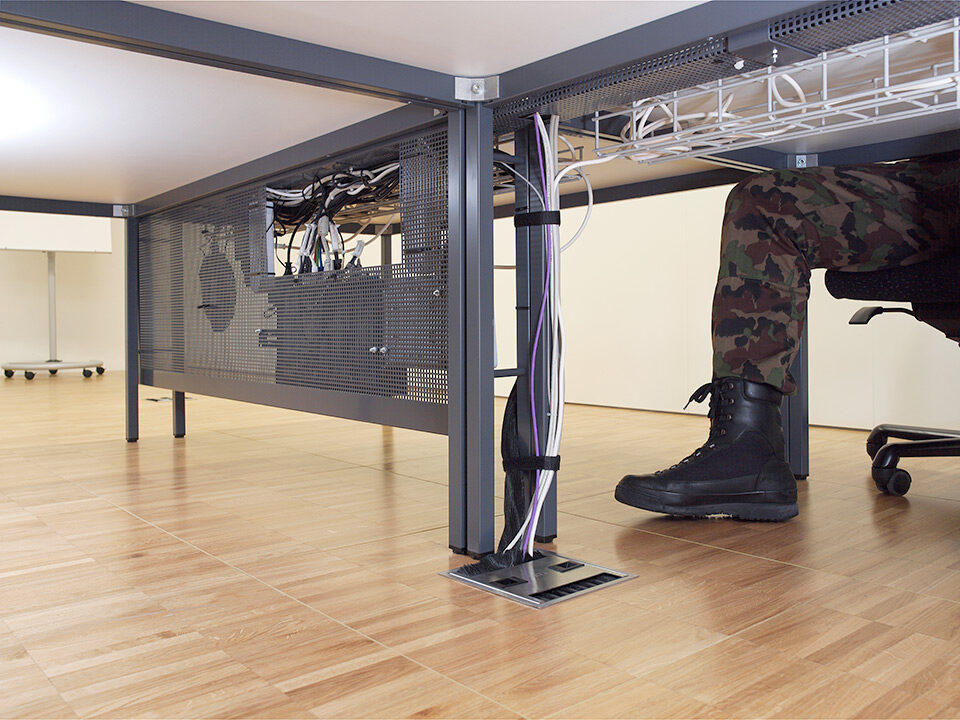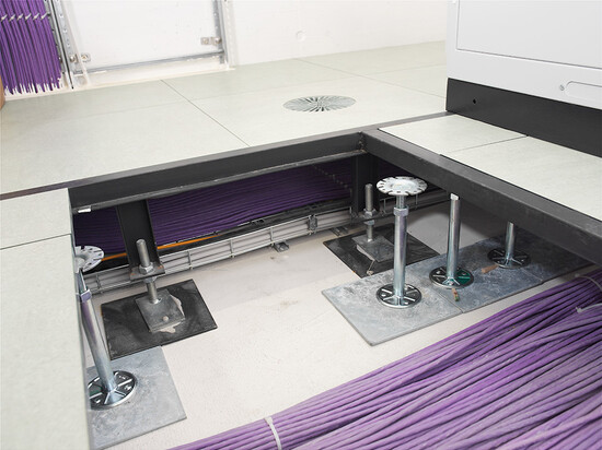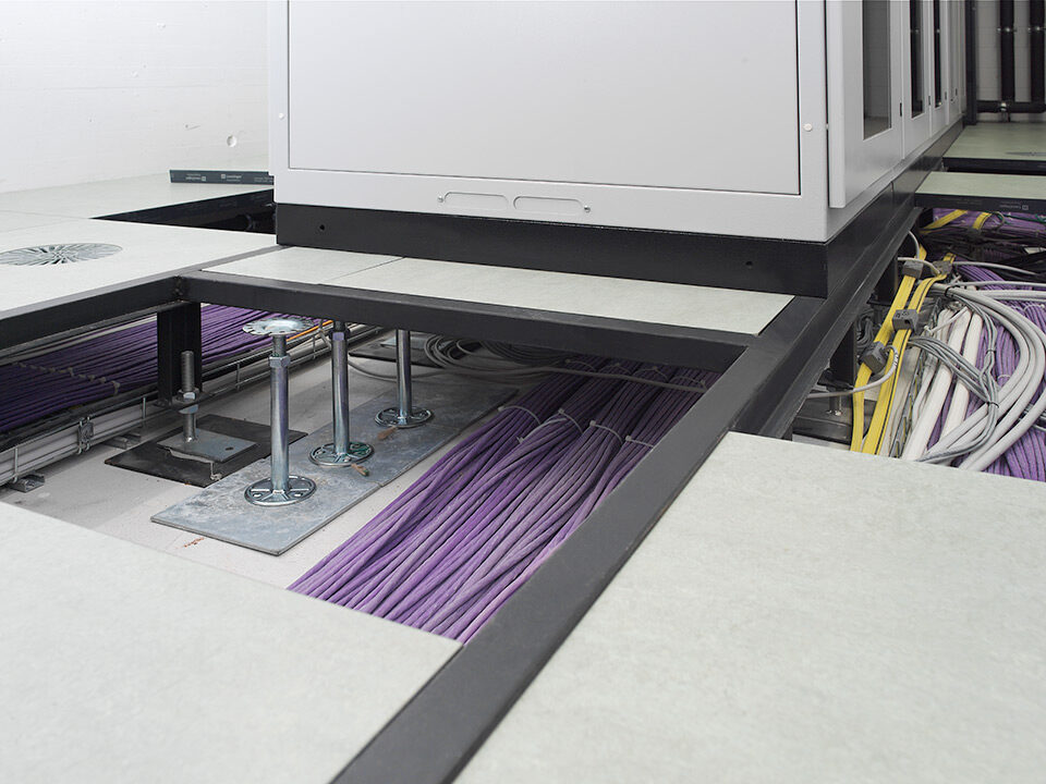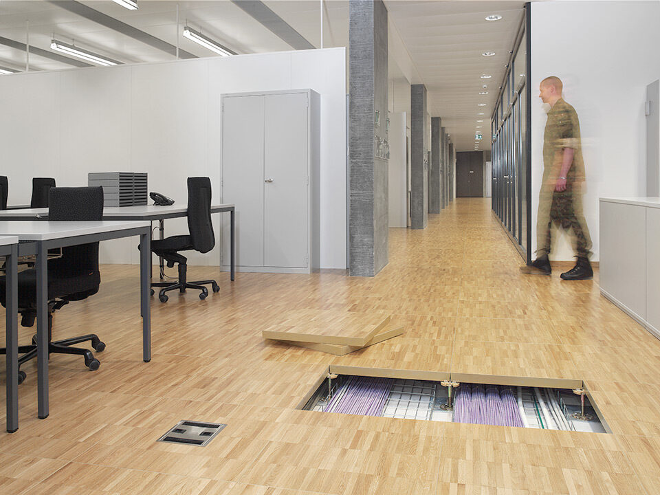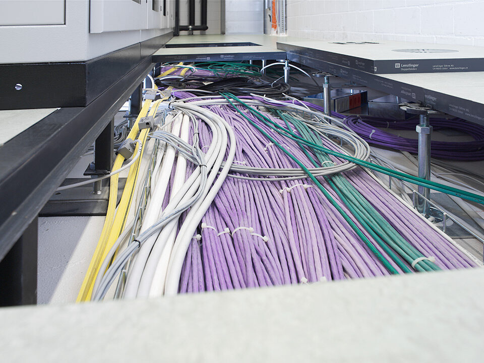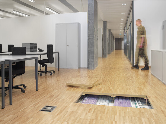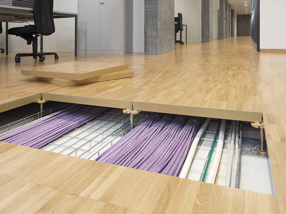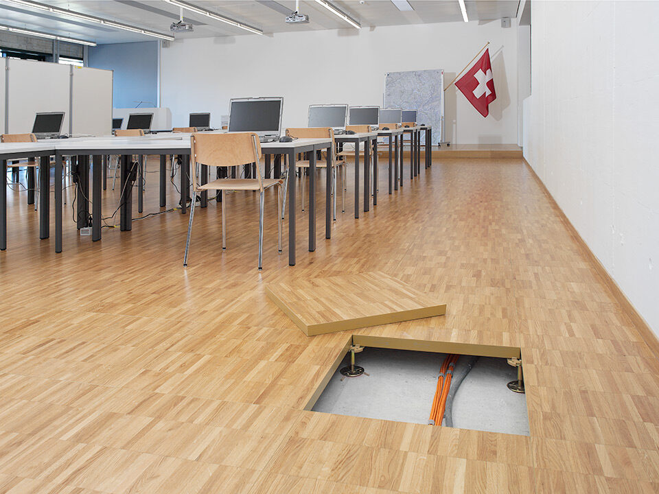 Livraison et installation de 3’100 m2 de faux-plancher dans les bureaux et les locaux techniques. Sous-construction de type 5 et panneaux en aggloméré haute densité avec un revêtement parquet à coller en chêne standard et revêtement dur Marmoleum Real.