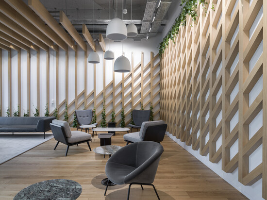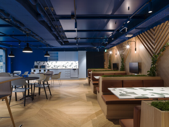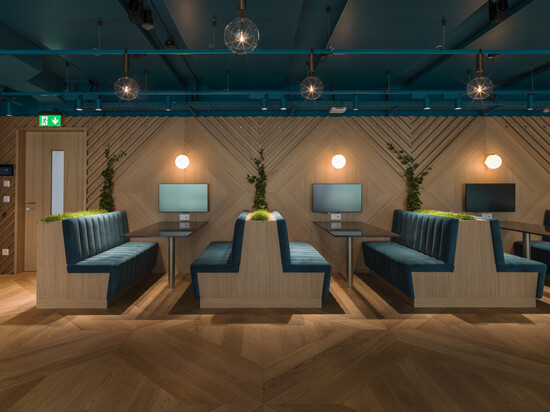 Les pièces maîtresses sous l'atrium tel que l'espace restauration et les salles de réunions, les faux-planchers ont été recouvert de parquet. Ce type de revêtement apporte une noblesse et rend l'espace convivial et chaleureux.