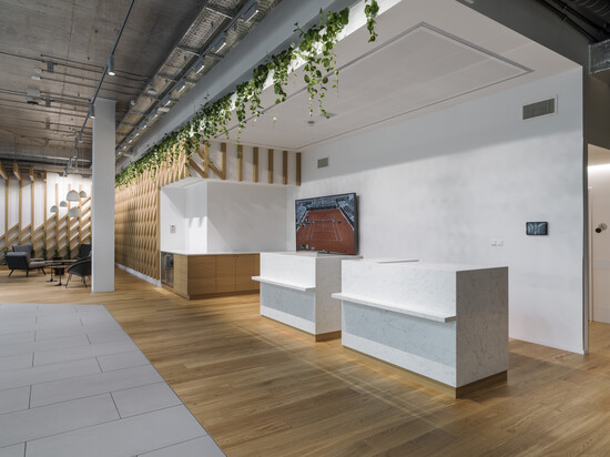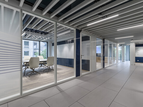 Des carreaux de céramique ont été utilisés dans la zone d'accueil et au niveau des escaliers. Faciles d'entretien et très résistant à l'usure et d'entretien, mais parfaitement intégrés à l'architecture noble et moderne. Tout en un seul morceau avec l'intégration de passages de câbles ou de trappes de visite, toute la technique sous le faux-plancher reste accessible