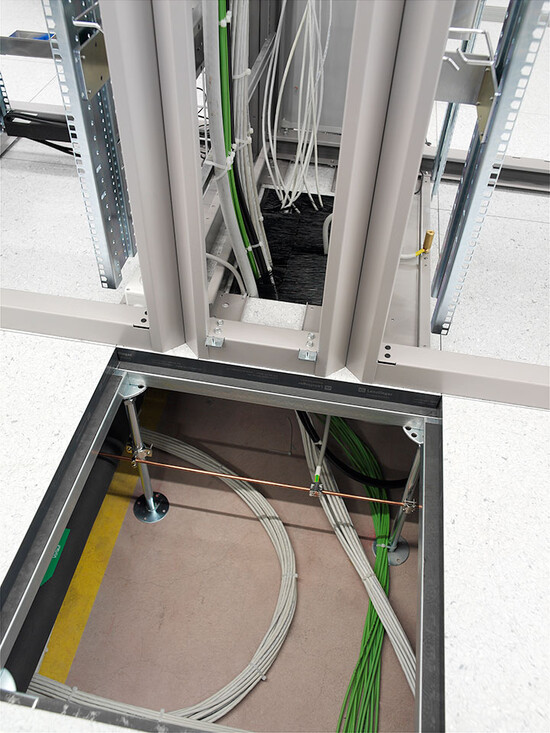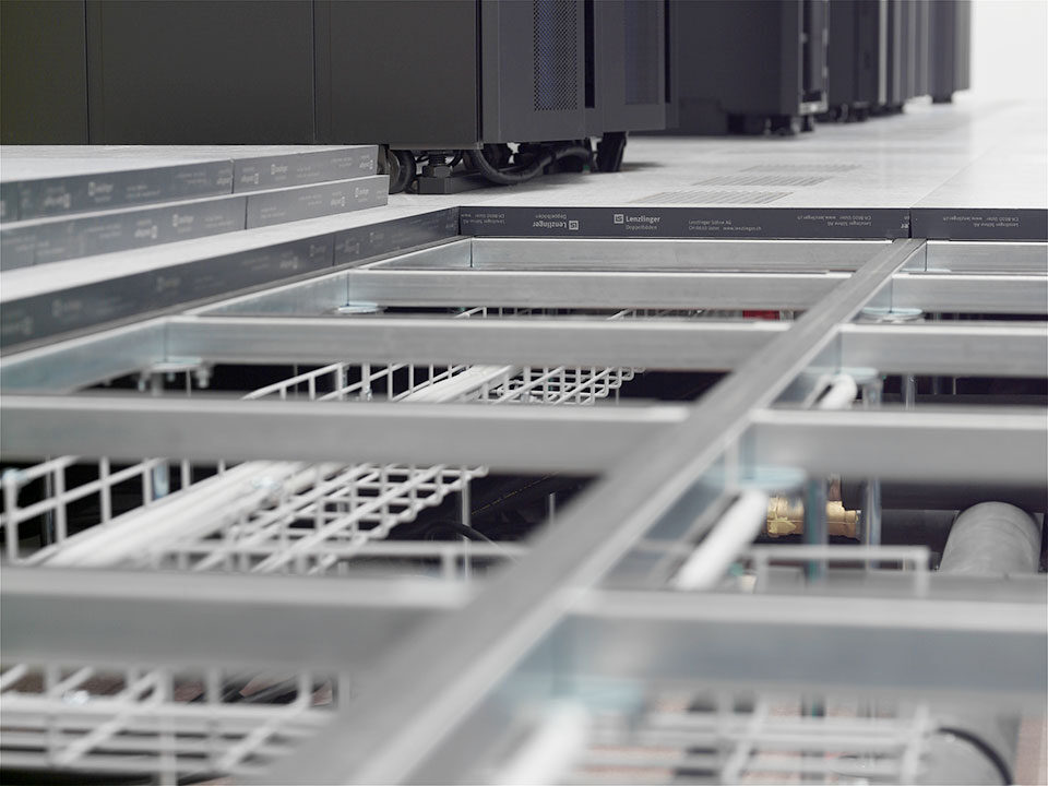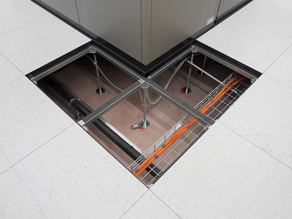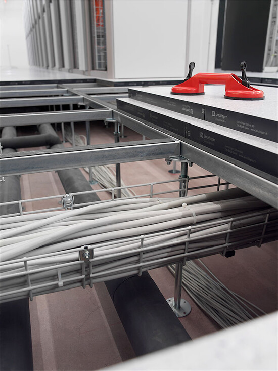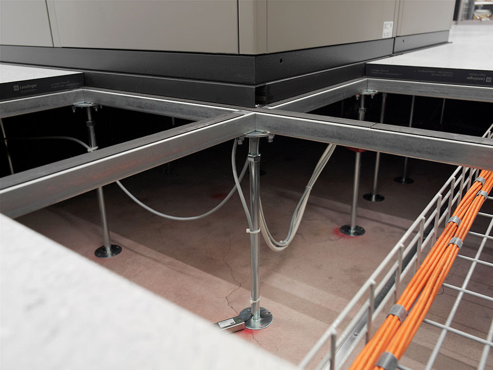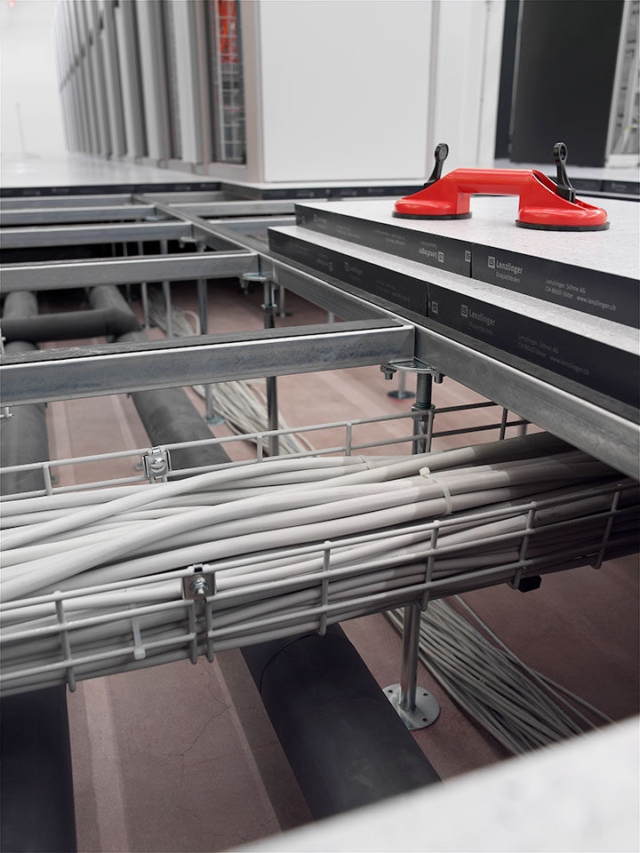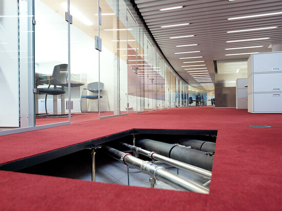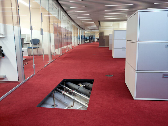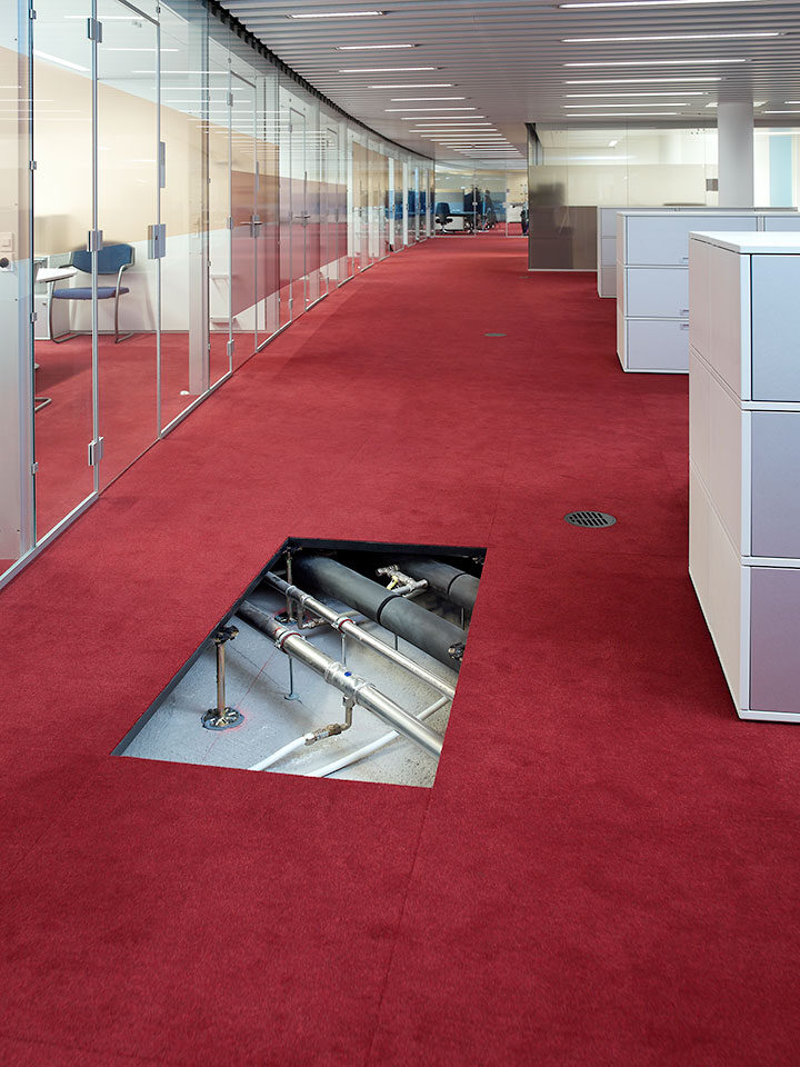 Faux-plancher de type 8 avec revêtement dur Colorex appliqué en usine pour l’aménagement du centre informatique. Dans les bureaux, faux-plancher de type 5 en panneaux d’aggloméré à très haute densité PSFF-38 avec dalles de moquette en pose libre.