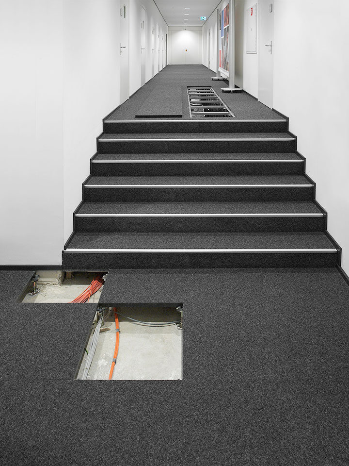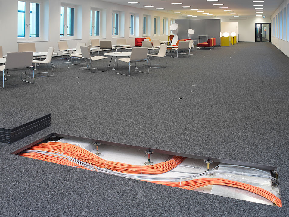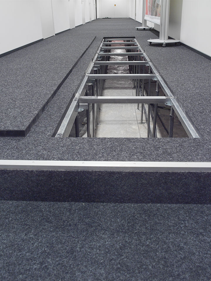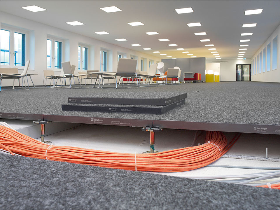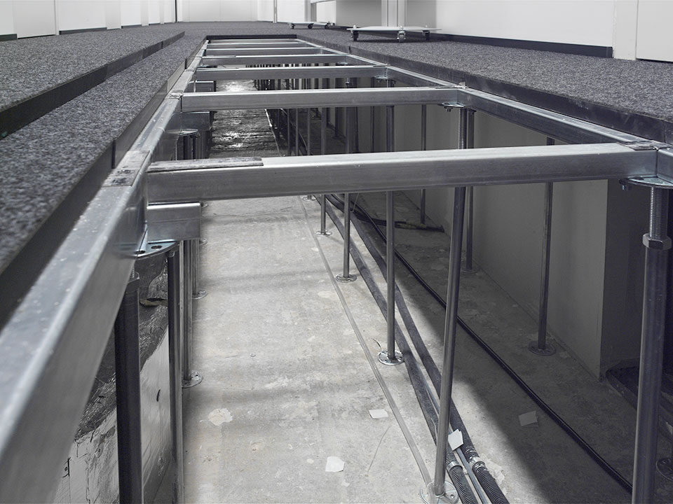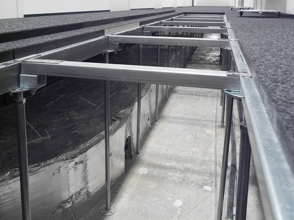 Livraison et installation d’environ 12 000 m2 de faux-planchers de type 5 avec panneaux de fibre minérale.